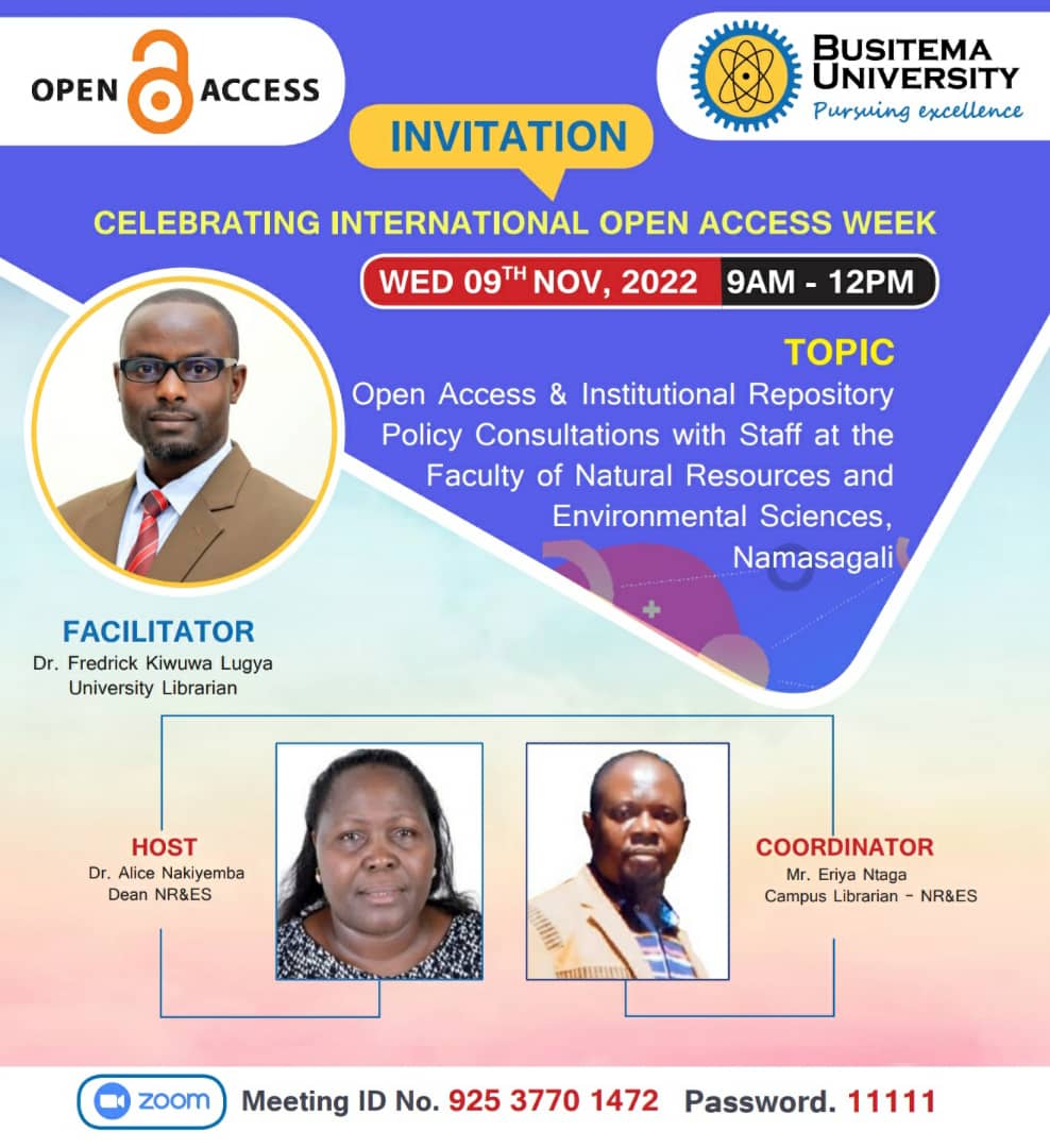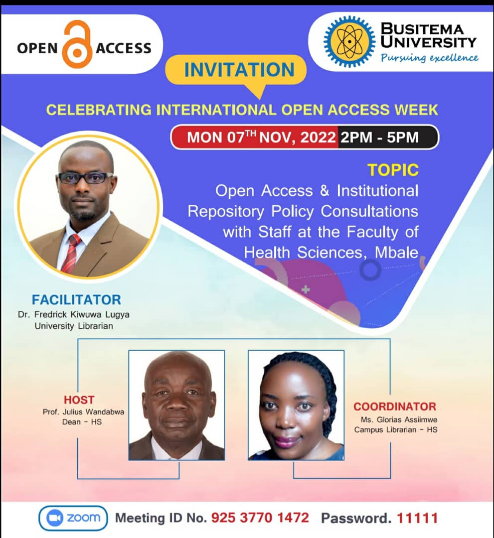 Follow the navigation bar to the week long activities, the Friday closing ceremony and links to the draft open access policy and institutional repository policy. We do welcome your participation and comments to improve the draft policies. Send all your comments to - library@busitema.ac.ug and cc to flugya@busitema.ac.ug