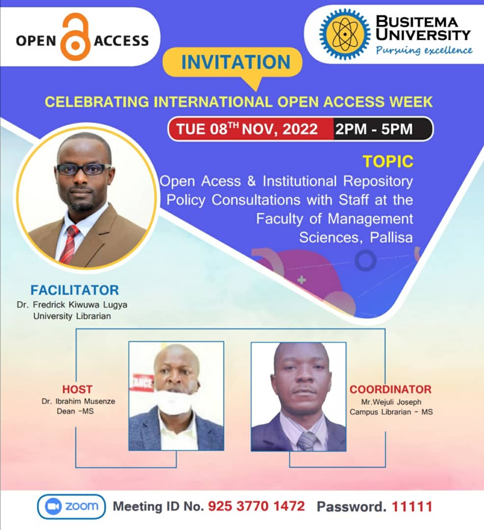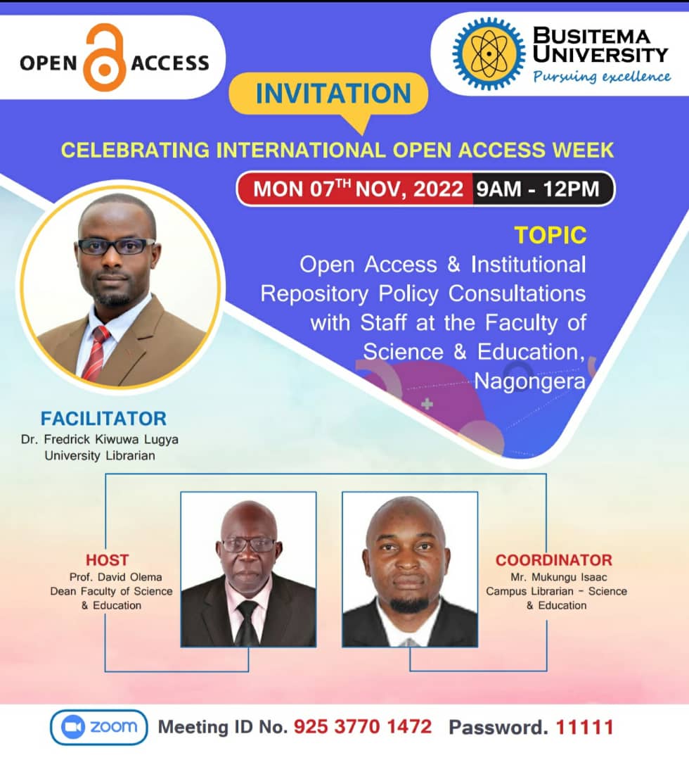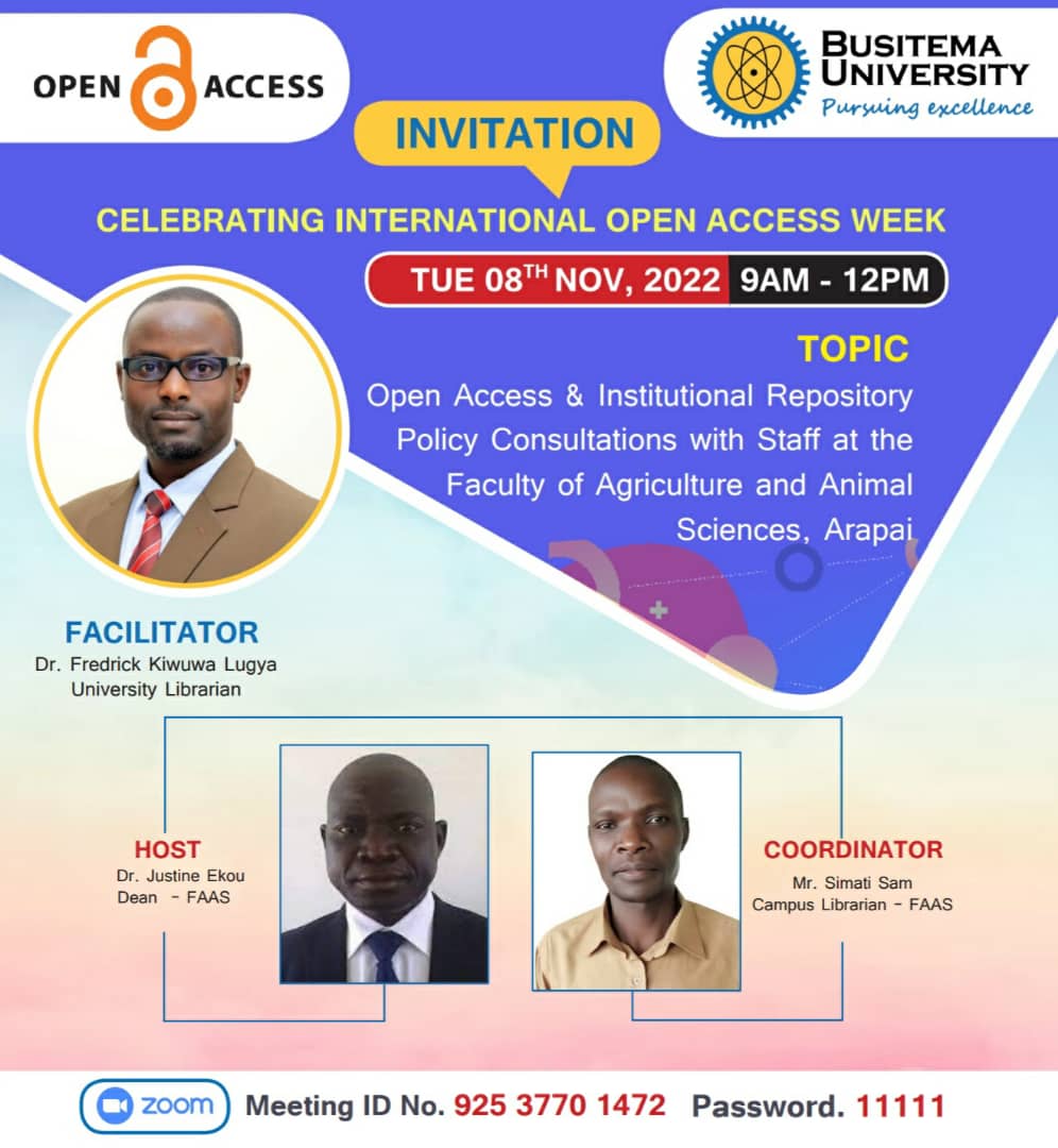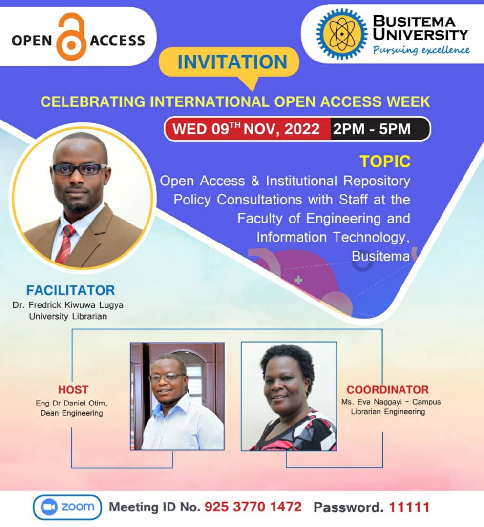 Busitema University will join the rest of the World to celebrate the International Open Access Week, November 7-11, 2022. The Open Access Week is an international event that brings together institutions, academics, researchers, librarians, administrators, policymakers, students and the entire community to advocate for free and immediate online access to scholarship.